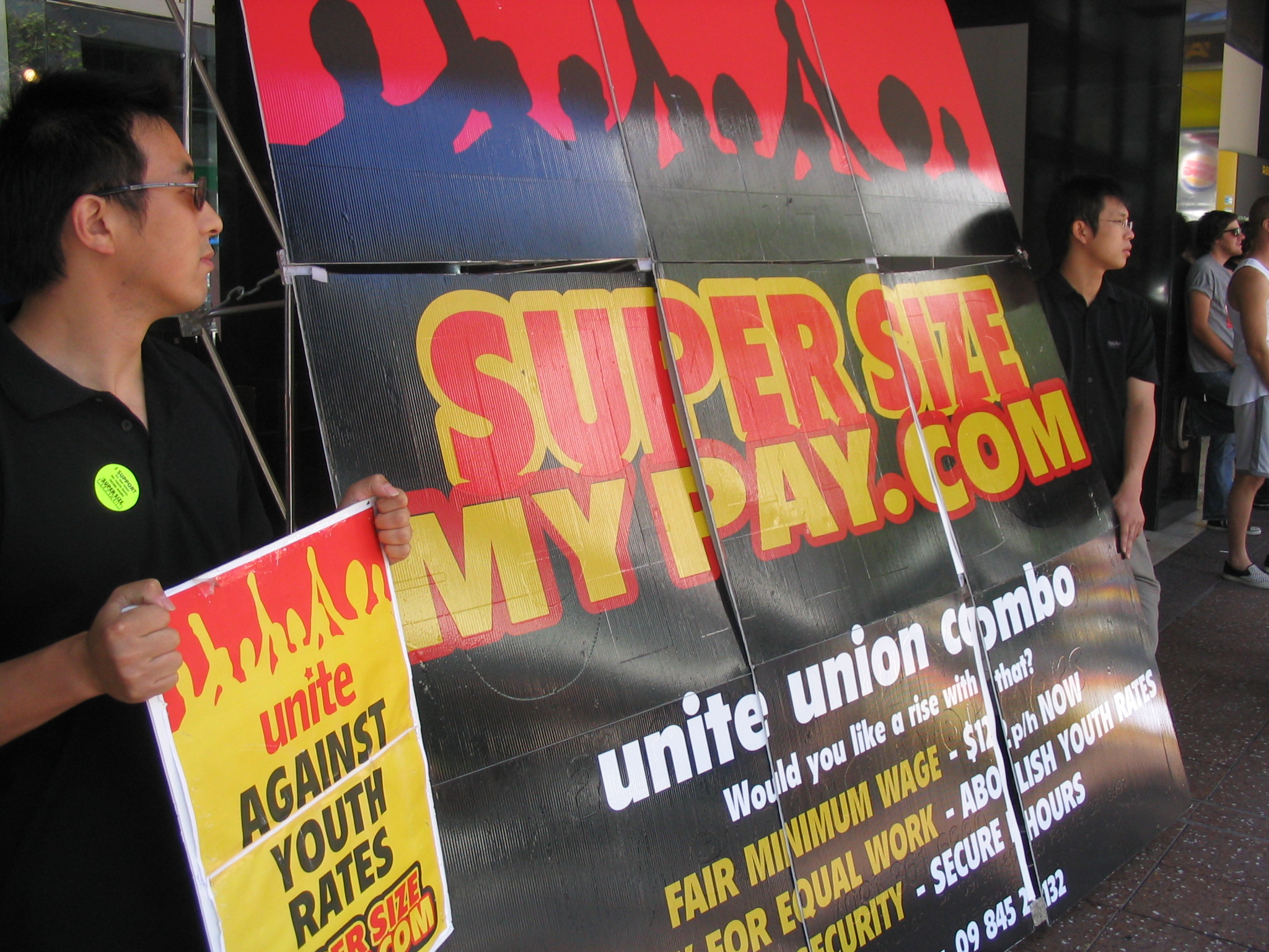 Unite launched the SupersizMyPay.Com campaign in 2003 for what was dubbed the "Unite Combo": Minimum wage increases, ending youth rates and secure hours.